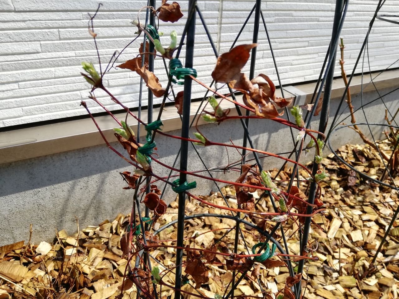 旧枝咲きのクレマチスということで、つるは大事に残しておきました。(枯れた葉もそのままにしちゃってるけど)