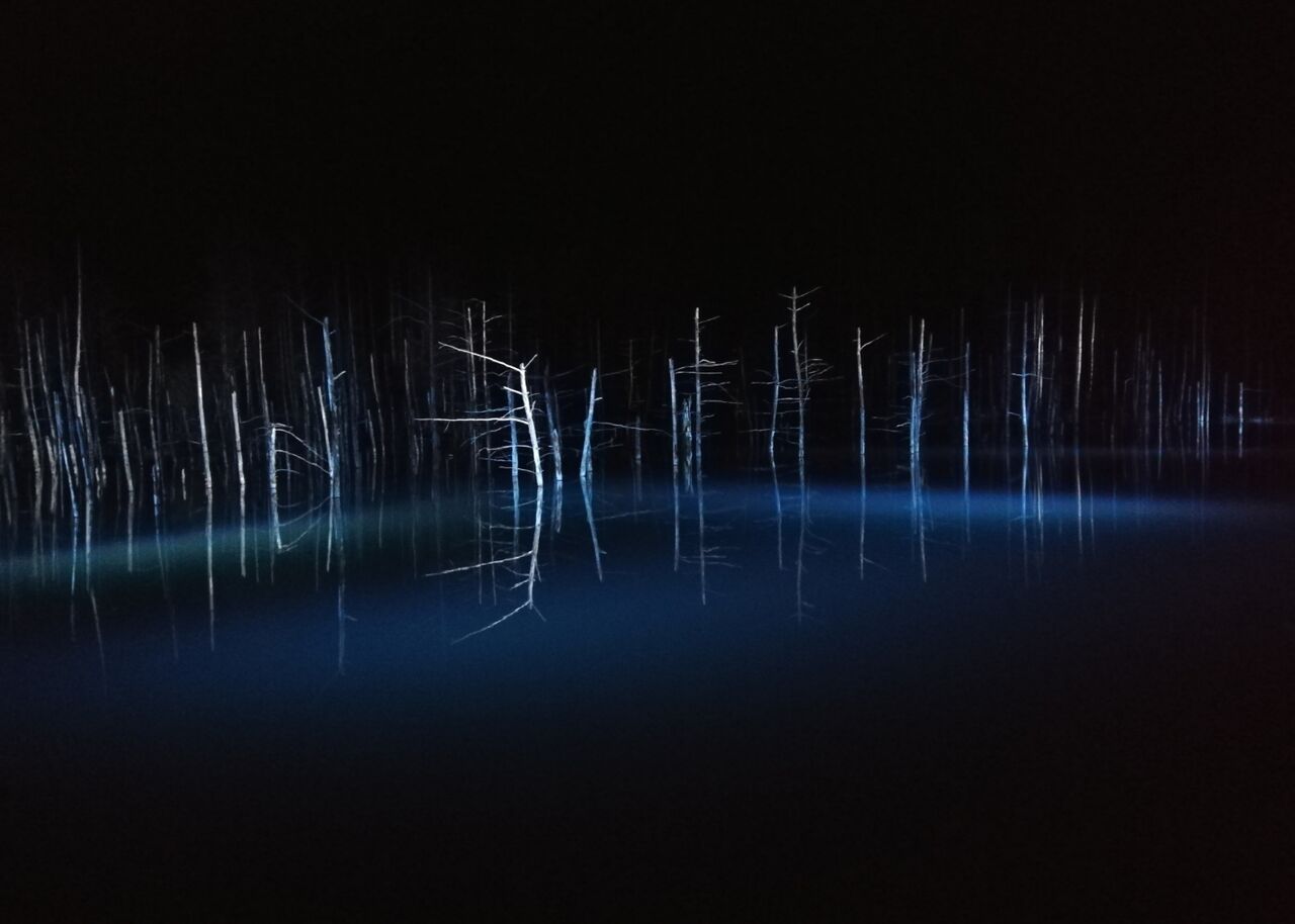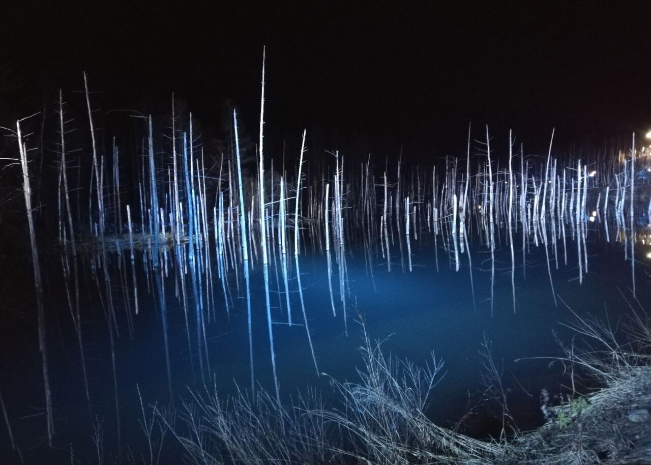 ライトアップされた夜の青い池へ行くことができるというもの。