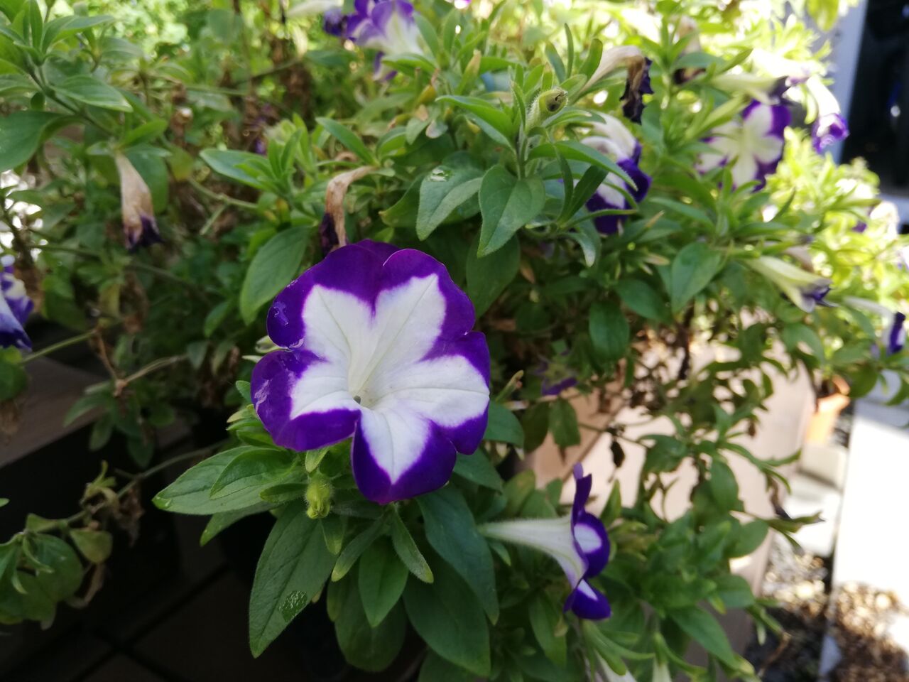 今年買った苗で、夏にはもっと白い花が咲いていたのですが、寒くなってきた最近は縁の紫が濃く咲いています。