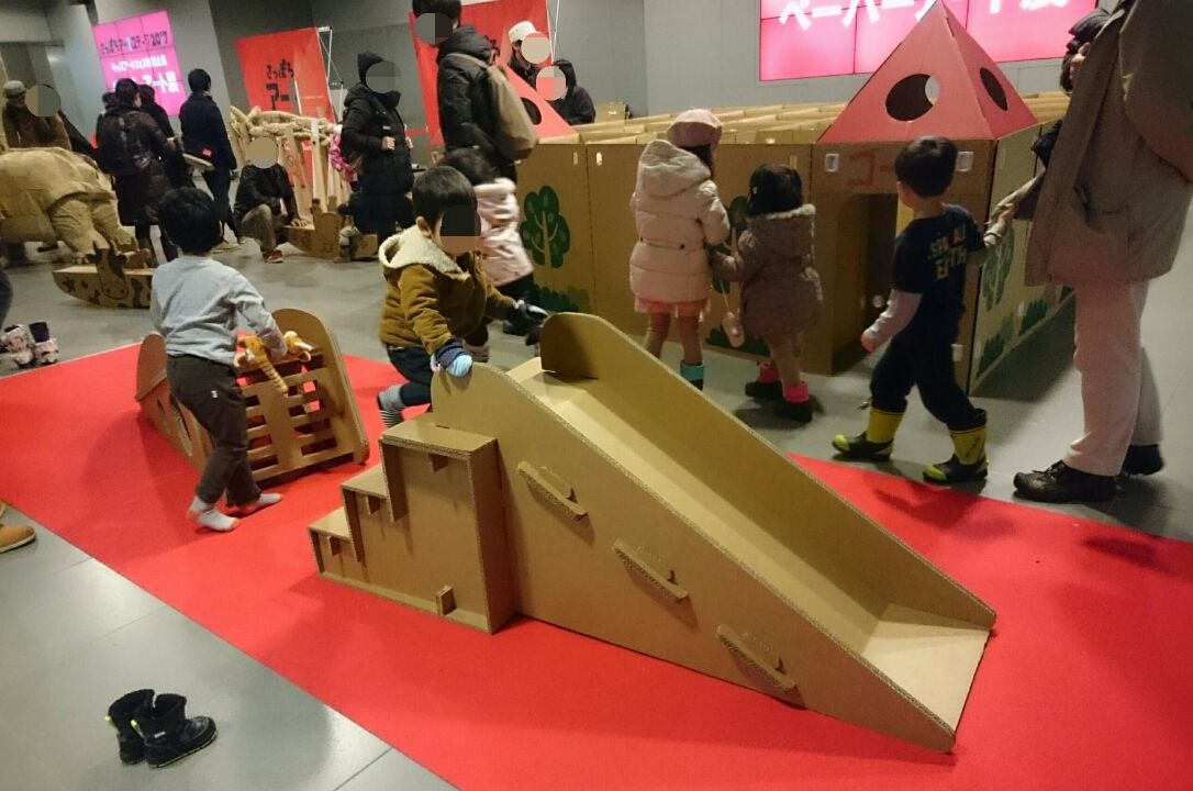 段ボールアート作品が展示され、段ボール遊具コーナーで長男も次男も遊びました。