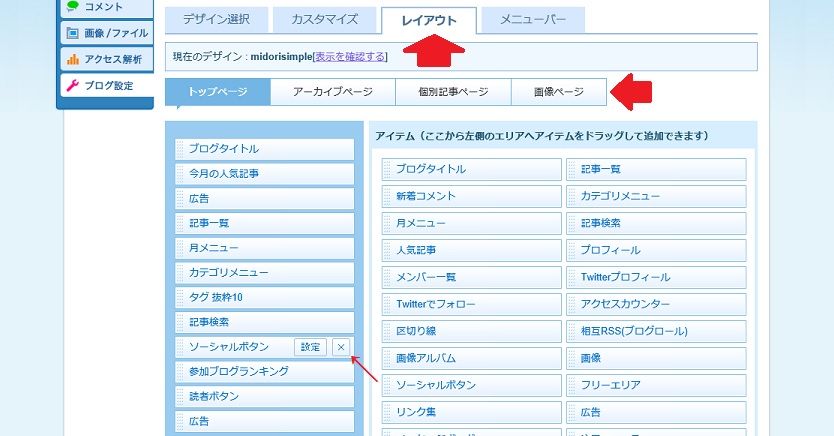 ▽ブログ設定から、外部サービスを選択▽ソーシャルボタンをアクティブにし、設置したいボタンにチェックを入れて、設定するをクリック