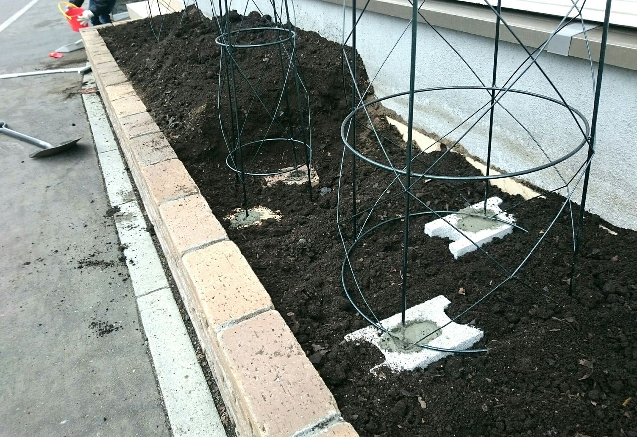 はやる気持ちを抑え、花や木を植える前にまずオベリスクを設置してみました。